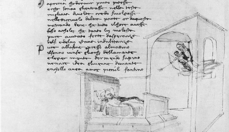 Firenze, Biblioteca Nazionale Centrale, B. R. 47, f. 104v. Venere e Cupido appaiono in sogno ad Africo mentre questi è nel suo letto.