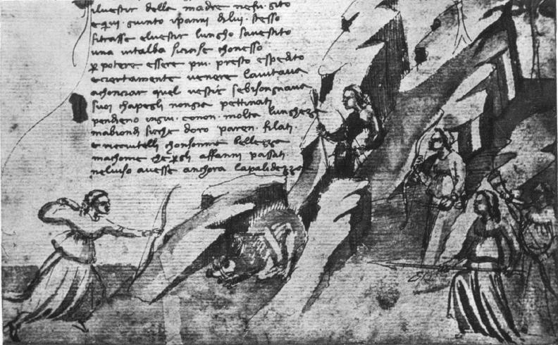 Firenze, Biblioteca Nazionale Centrale, B. R. 47, f. 106r. Africo, travestitosi da donna, uccide un cinghiale durante una battuta di caccia con le ninfe.