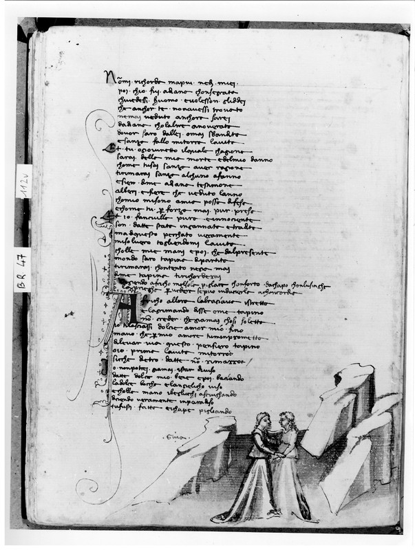 Firenze, Biblioteca Nazionale Centrale, B. R. 47, f. 111r. Africo siede accanto a Mensola e tenta di confortarla.