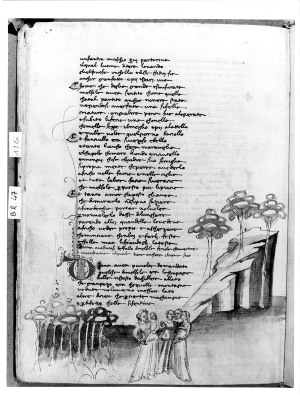 Firenze, Biblioteca Nazionale Centrale, B. R. 47, f. 126v. Le ninfe scoprono Pruneo nascosto tra i cespugli.