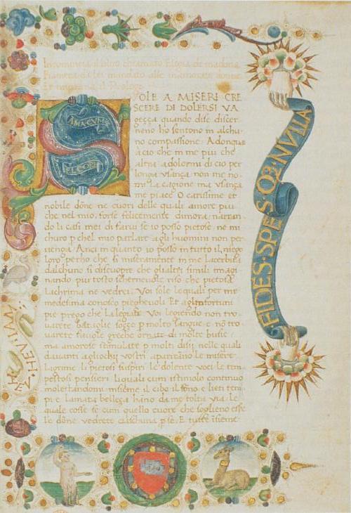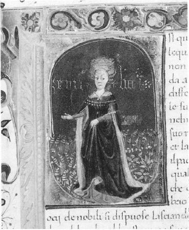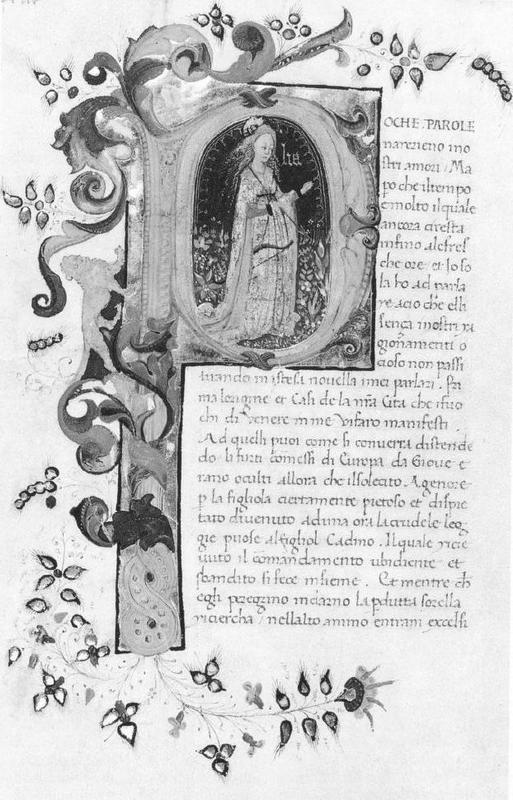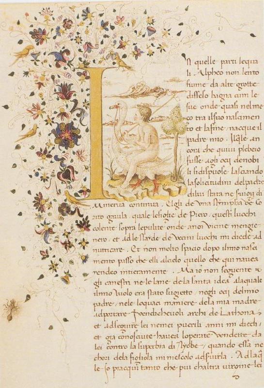 Londra, British Library, Add. 10299, f. 40r. Il copista del manoscritto è stato identificato con Michele Salvatico. La ninfa Emilia, all'interno dell'iniziale figurata I(n quelle).