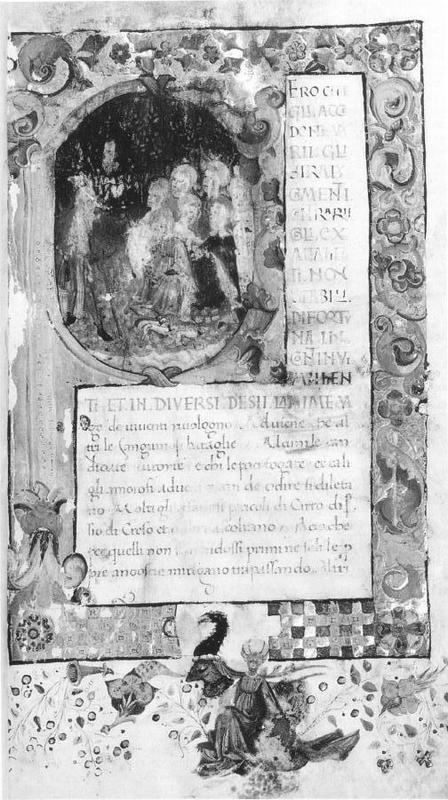 Firenze, Biblioteca Medicea Laurenziana, Plut. 90 inf. 49, f. 1r. Il copista del manoscritto, datato gennaio 1436, è Giovanni Vespucci. Ritratto a mezzobusto dell'autore Giovanni B…