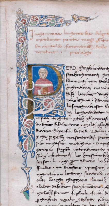 Firenze, Biblioteca Medicea Laurenziana, Plut. 41.35, f. 1r. Ritratto a mezzobusto dell'autore Giovanni Boccaccio con un libro tra le mani, all'interno dell'iniziale figurata P(erò…