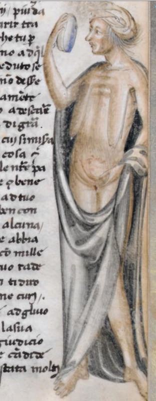 Firenze, Biblioteca Medicea Laurenziana, Plut. 42.34, f. 41r. Una vecchia vedova dai seni cadenti, parzialmente avvolta in un manto grigio e con i capelli celati da un turbante, si…