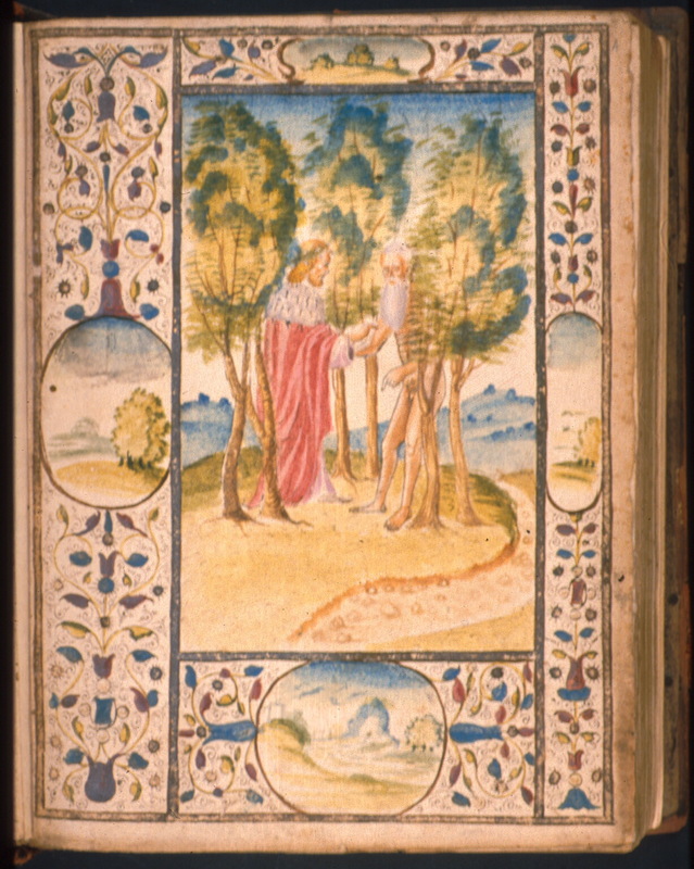 Firenze, Biblioteca Nazionale Centrale, II.II.17, f. 50v. Il copista del manoscritto, datato 1414, è Andrea di Pierino da Firenze. Ameto e Lia, ritratti a figura intera, conversano…
