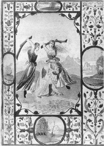 Glasgow, University of Glasgow, Library of the Hunterian Museum, Hunter 29 (S.2.19), f. IIv. L'autore Giovanni Boccaccio viene bastonato da due donne; nella cornice a margine quatt…