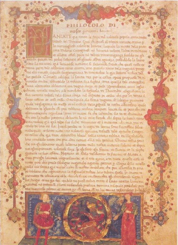 Kassel, Universitätsbibliothek Kassel, Landesbibliothek und Murhardsche Bibliothek der Stadt Kassel, 2° poet. et roman. 3, f. 2v. Fiammetta, vestita di rosso e incoronata, si reca …