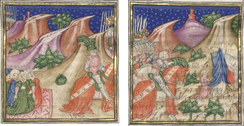 Miniatore lombardo (1450 c.), Lelio si volge per salutare Giulia; Lelio e i suoi compagni assistono a una messa prima della battaglia