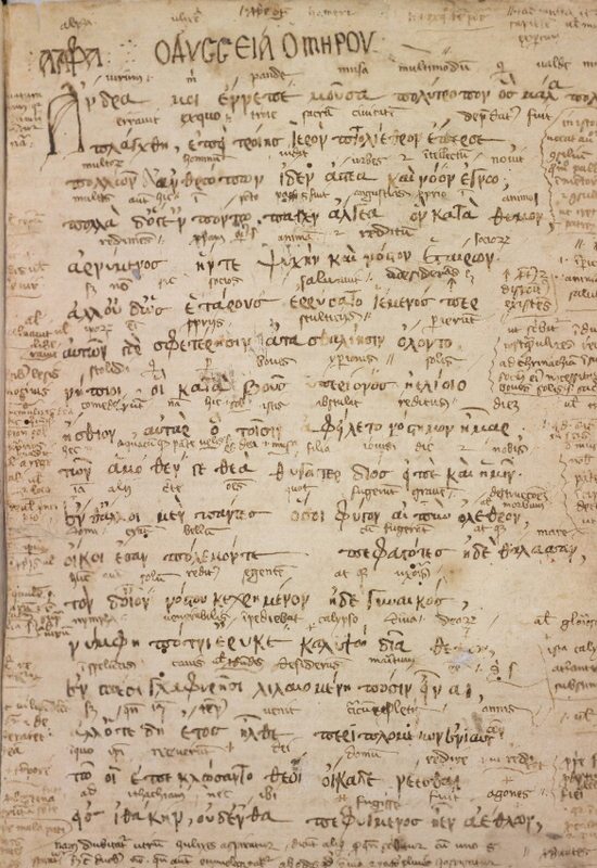 Cart., cc. III + 323 + III’, mm. 297 × 225. Omero, "Odissea" (con traduzione interlineare latina di Leonzio Pilato). Risalente all’inizio degli anni ’60 del sec. XIV; inviato dal B…