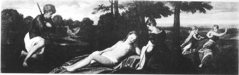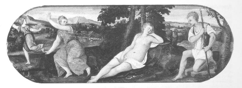Ubicazione sconosciuta. Cimone osserva Efigenia addormentata in un giardino, mentre due ancelle fuggono terrorizzate. Permangono dubbi sull'autografia dell'opera.