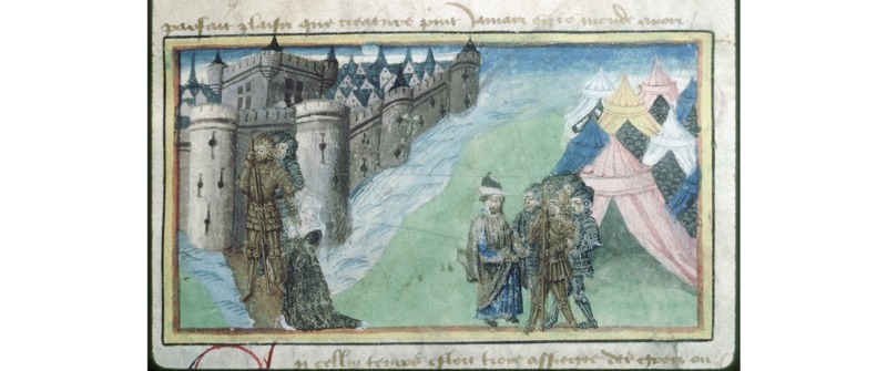 Miniatore francese (1480 c.), Troiolo e Pandaro sono in attesa fuori le mura di Troia
