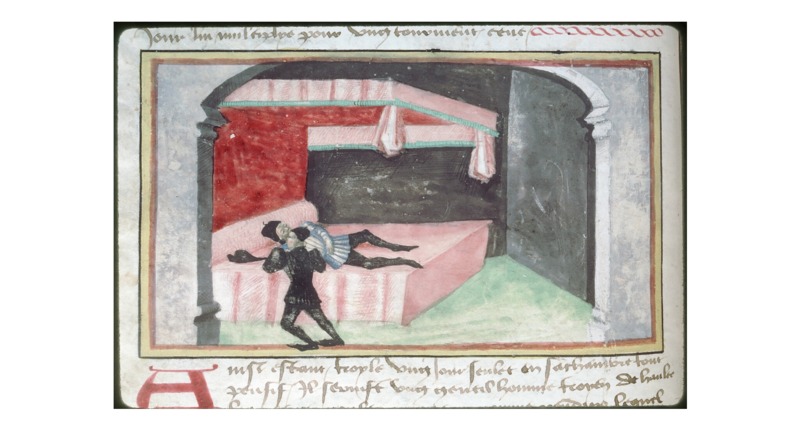 Oxford, Bodleian Library, Douce 331, f. 43v. Pandaro tenta di consolare Criseide, la quale giace a letto torcendosi le mani dal dolore.