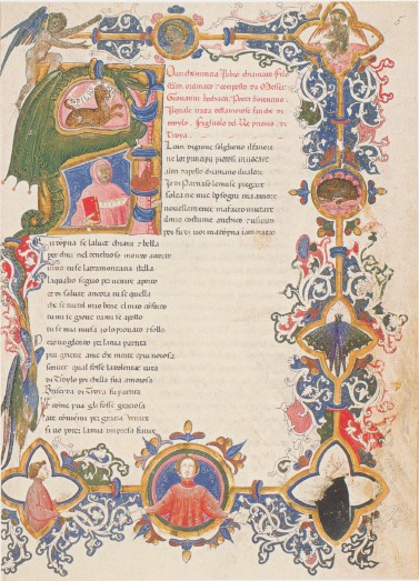 Londra, British Library, Add. 21246, f. 5r. Ritratto dell'autore Giovanni Boccaccio con un libro, all'interno dell'iniziale figurata e zoomorfa A(lcun); nel margine inferiore della…