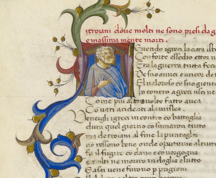 Madrid, Biblioteca Nacional de España, Vit. 16.3, f. 2r. Ritratto dell'autore Giovanni Boccaccio intento a scrivere, all'interno dell'iniziale figurata a bianchi girari M(olte); ne…