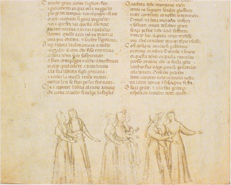 Firenze, Biblioteca Nazionale Centrale, II.II.90, f. 68v. Un gruppo di donne troiane si reca in processione al tempio di Atena.