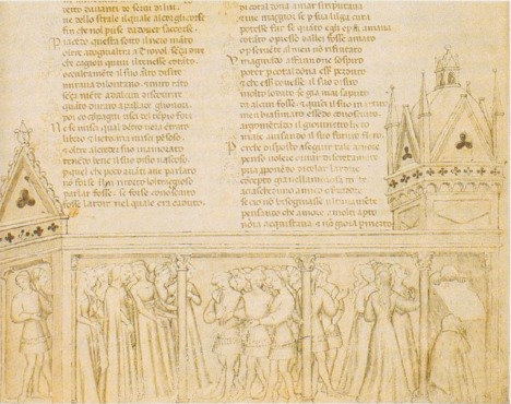Firenze, Biblioteca Nazionale Centrale, II.II.90, f. 73r. Pandaro corteggia Criseide per conto dell'amico Troiolo.