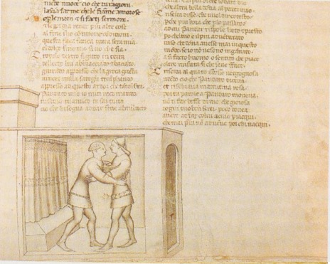Firenze, Biblioteca Nazionale Centrale, II.II.90, f. 72r. Troiolo e Pandaro si abbracciano prima di separarsi.