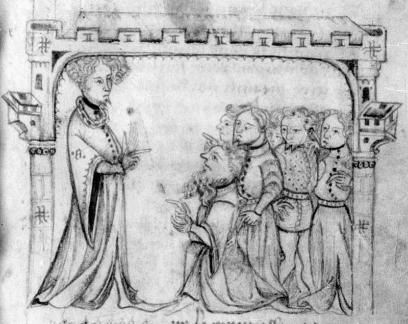 Parigi, Bibliothèque Nationale de France, Fr. 2203, f. 7r. Il manoscritto è datato 1395. Gualtieri riceve una delegazione di sudditi, i quali lo esortano a prendere moglie.