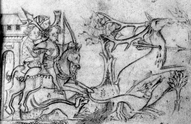 Parigi, Bibliothèque Nationale de France, Fr. 2203, f. 14r. Il manoscritto è datato 1395. Gualtieri e il suo seguito si recano a caccia di un cervo.