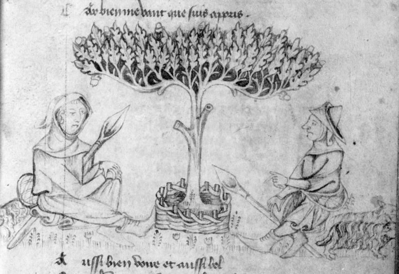 Parigi, Bibliothèque Nationale de France, Fr. 2203, f. 25r. Il manoscritto è datato 1395. Due uomini in arme siedono sotto un albero.