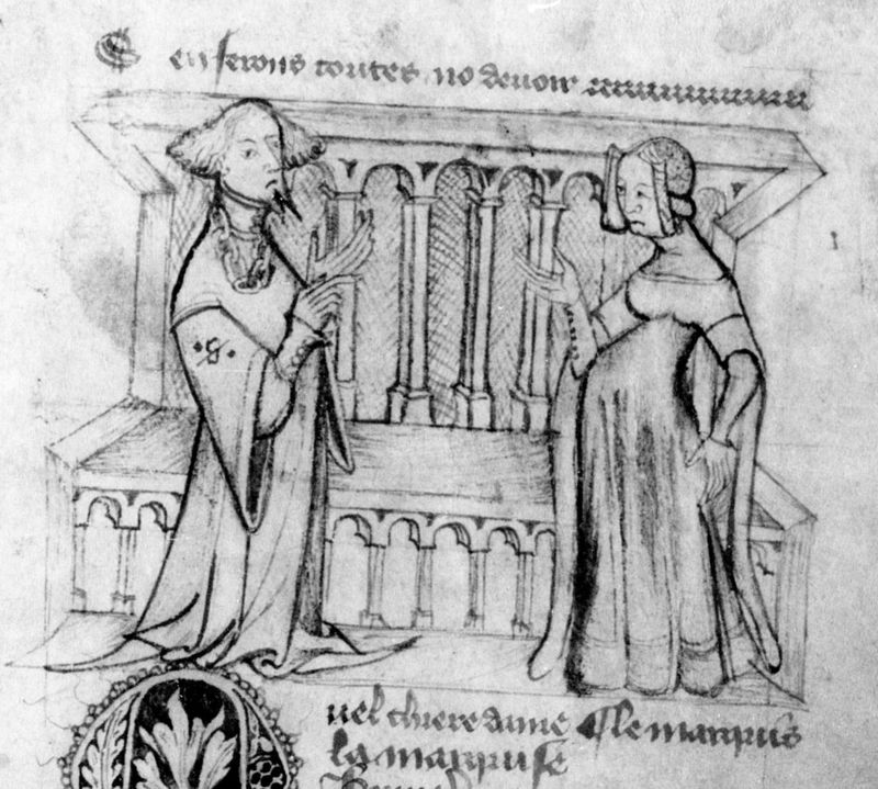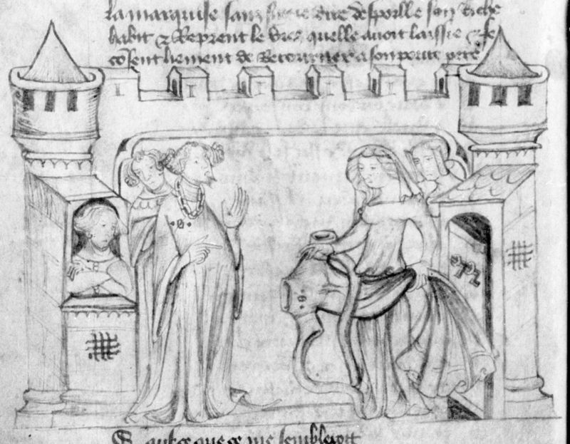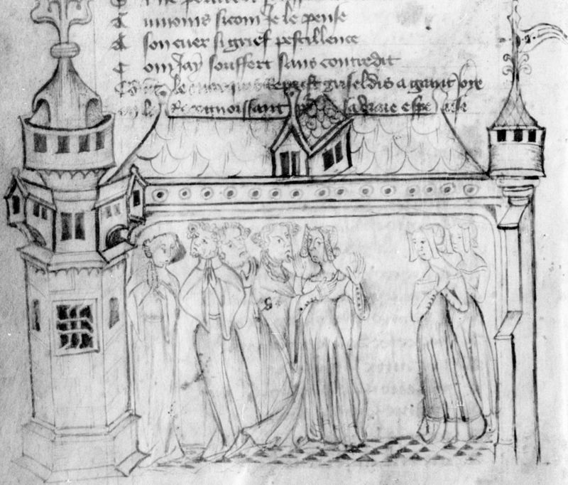 Parigi, Bibliothèque Nationale de France, Fr. 2203, f. 16r. Il manoscritto è datato 1395. Un cavaliere al seguito di Gualtieri indica al marchese la figura di Griselda.
