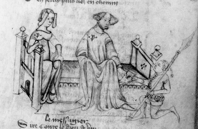 Parigi, Bibliothèque Nationale de France, Fr. 2203, f. 33r. Il manoscritto è datato 1395. Gualtieri a colloquio con Griselda.