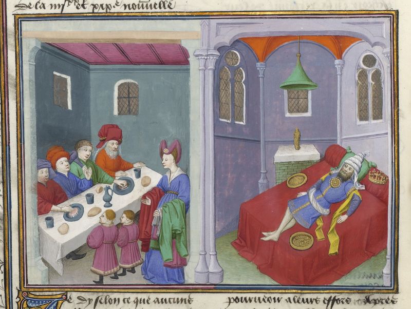 Maestro di Jean Mansel (1430-1450), La moglie di messer Torello offre doni al Saladino e ai suoi compagni; messer Torello giace sul letto addormentato