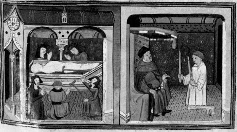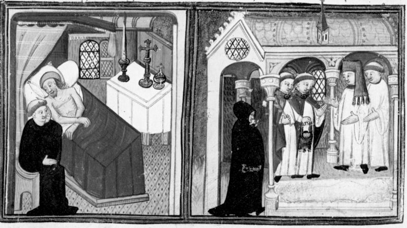 Miniatore francese (1425-1450), La confessione di Ser Ciappelletto morente; i fedeli vengono invitati alla devozione