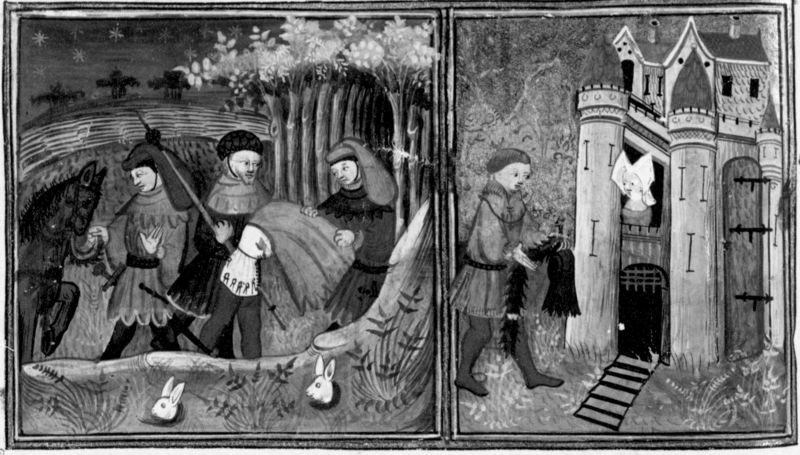 Maestro di Jean Mansel (1430-1450), Re Carlo osserva le figlie di Neri degli Uberti andare a pesca; il re fa sposare le fanciulle