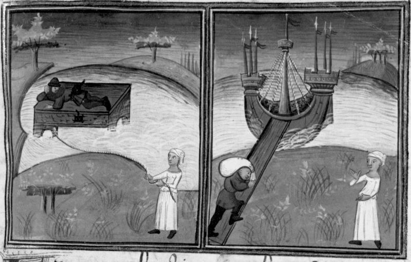 Parigi, Bibliothèque Nationale de France, Fr. 12421, f. 58r. Landolfo Rufolo, salvatosi dal naufragio aggrappato ad una cassa, viene tirato a riva da una donna; Landolfo, recuperat…