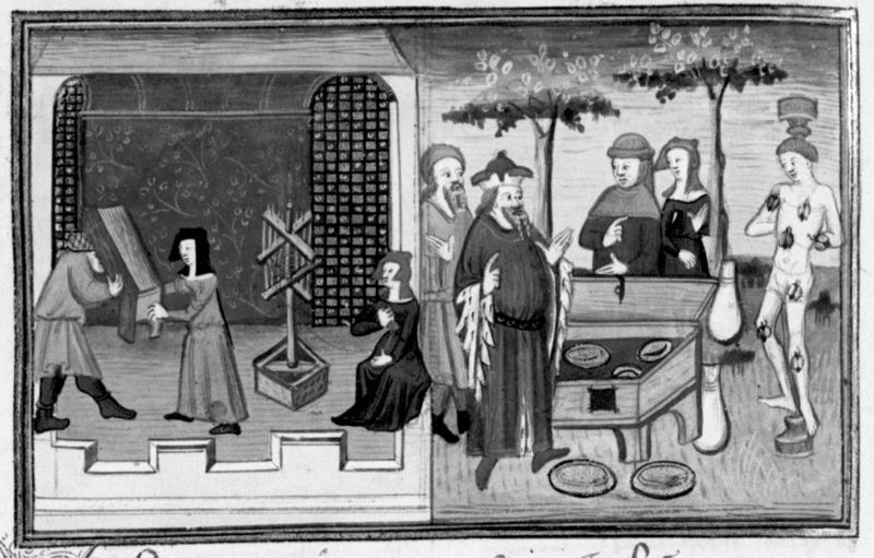 Parigi, Bibliothèque Nationale de France, Fr. 12421, f. 31r. Un uomo viene interrogato da un frate inquisitore; l'inquisitore riceve di nascosto del denaro.