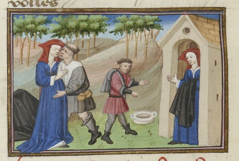 Scuola del Maestro del Duca di Bedford (1430 c.), Calandrino invita Niccolosa a seguirlo; la moglie di Calandrino sorprende il marito con Niccolosa