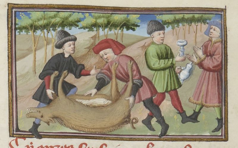 Scuola del Maestro del Duca di Bedford (1430 c.), Bruno e Buffalmacco si dividono il maiale; un uomo offre da bere a Calandrino