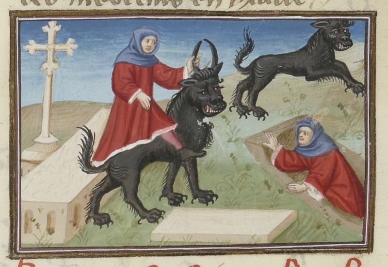 Parigi, Bibliothèque Nationale de France, Fr. 239, f. 273r. Gentile Carisendi salva Catalina dalla tomba dove ella era stata riposta perché creduta morta; Gentile affida la donna a…