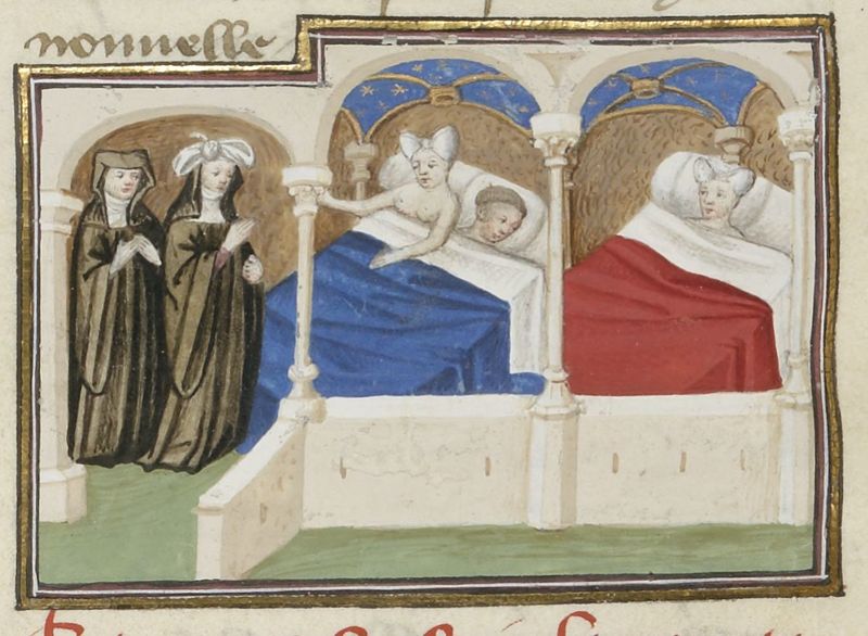 Parigi, Bibliothèque Nationale de France, Fr. 239, f. 247v. La monaca Isabetta viene sorpresa nel letto con un amante dalla badessa, la quale indossa le braghe di un prete al posto…