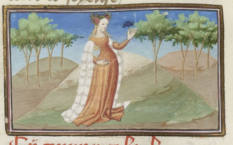 Parigi, Bibliothèque Nationale de France, Fr. 239, f. 266r. Alla fine della giornata Neifile canta una ballata tenendo in mano un fiore.