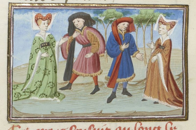 Scuola del Maestro del Duca di Bedford (1430 c.), Dianora conversa con Ansaldo; la donna parla con suo marito
