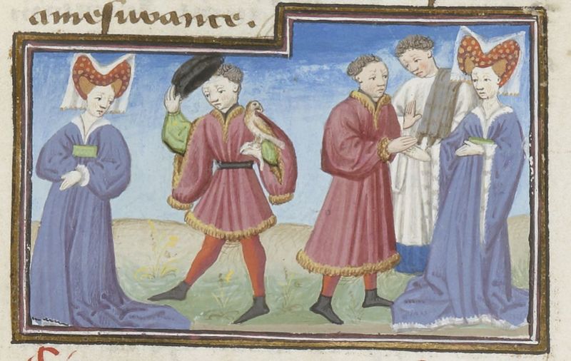 Parigi, Bibliothèque Nationale de France, Fr. 239, f. 162r. Federigo degli Alberighi, con il proprio falcone sul pugno, saluta monna Giovanna; Federigo e Giovanna si uniscono in ma…