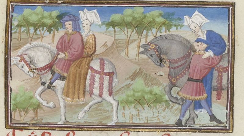 Parigi, Bibliothèque Nationale de France, Fr. 239, f. 170r. Madonna Oretta accetta il passaggio e la compagnia di un cavaliere; annoiata dall'uomo, Oretta si fa aiutare a smontare …
