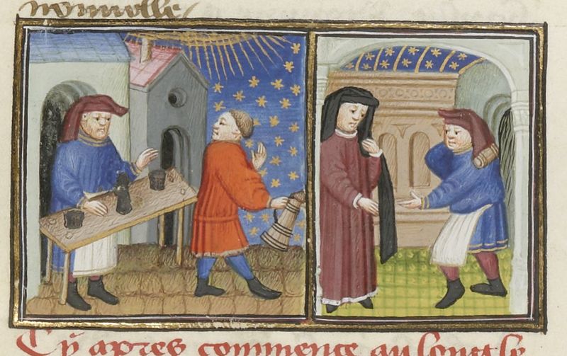 Parigi, Bibliothèque Nationale de France, Fr. 239, f. 187v. Il marito di Peronella entra nella botte per pulirla; l'uomo si fa convincere dalla moglie a trasportare la botte a cas…
