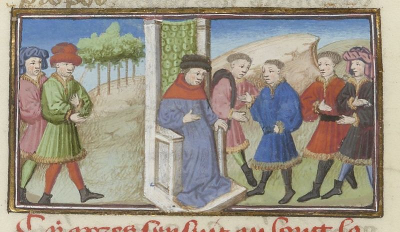 Parigi, Bibliothèque Nationale de France, Fr. 239, f. 175r. Michele Scalza fa una scommessa con Neri Vannini; Michele difende le proprie argomentazioni dinanzi a Piero di fiorentin…
