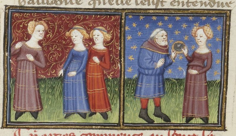 Scuola del Maestro del Duca di Bedford (1430 c.), Cesca si allontana da due donne; lo zio Fresco porge alla donna uno specchio