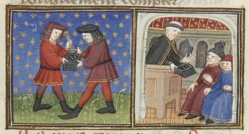 Parigi, Bibliothèque Nationale de France, Fr. 239, f. 179v. Giovanni del Bragoniera e Biagio Pizzini scambiano la piuma dell'angelo di fra' Cipolla con dei carboni; il frate mostra…
