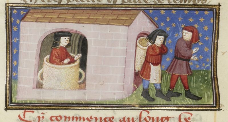 Scuola del Maestro del Duca di Bedford (1430 c.), Il marito di Peronella entra nella botte; l'uomo porta la botte a casa di Giannello