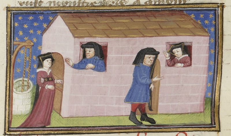 Parigi, Bibliothèque Nationale de France, Fr. 239, f. 191v. Tofano chiude la moglie Ghita fuori casa, così la donna richiama la sua attenzione gettando una pietra nel pozzo; per ri…