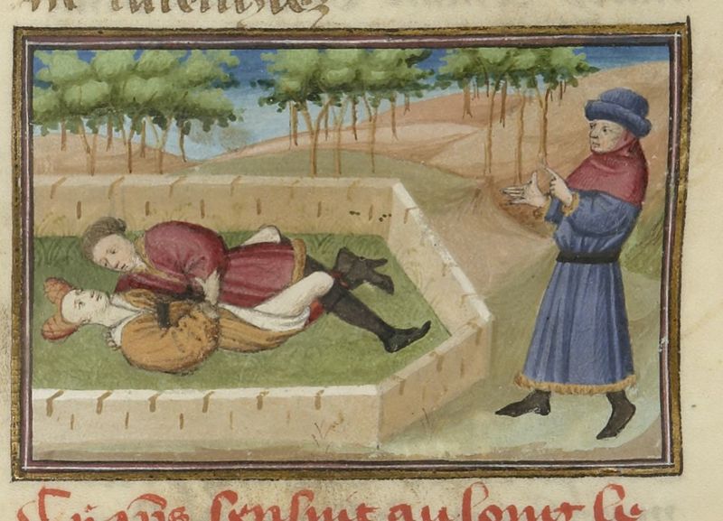 Scuola del Maestro del Duca di Bedford (1430 c.), Tingoccio e Meuccio corteggiano monna Mita; Tingoccio da morto visita Meuccio