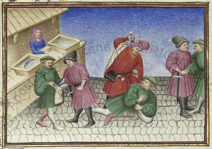 Maestro della Cité des Dames (1414-1419), Biondello mostra le lamprede a Ciacco; messer Filippo bastona Biondello; Ciacco e Biondello si riappacificano
