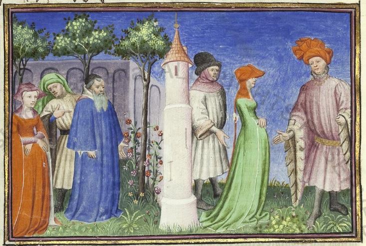 Città del Vaticano, Biblioteca Apostolica Vaticana, Pal. lat. 1989, f. 313v. Il copista del manoscritto, datato 15 giugno 1414, è Laurent de Premierfait. La moglie di messer Torell…