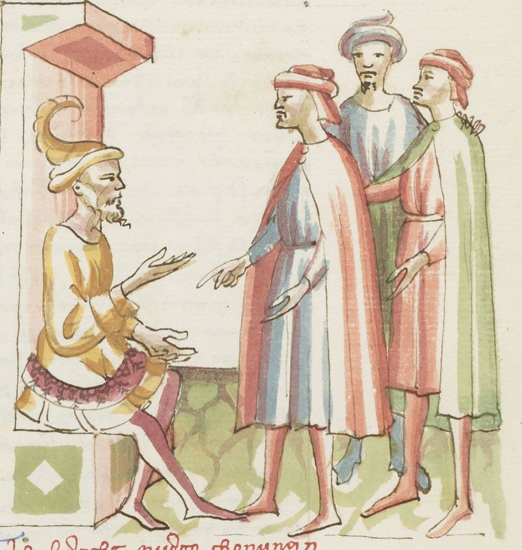 Città del Vaticano, Biblioteca Apostolica Vaticana, Pal. lat. 1989, f. 293v. Il copista del manoscritto, datato 15 giugno 1414, è Laurent de Premierfait. Mitridanes incontra Natan …