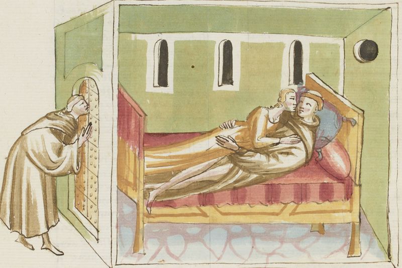 Parigi, Bibliothèque Nationale de France, It. 63, f. 20v. Il copista del manoscritto, datato 10 ottobre 1427, è Ludovico di Salvestro Ceffini. L'abate sorprende un giovane monaco p…